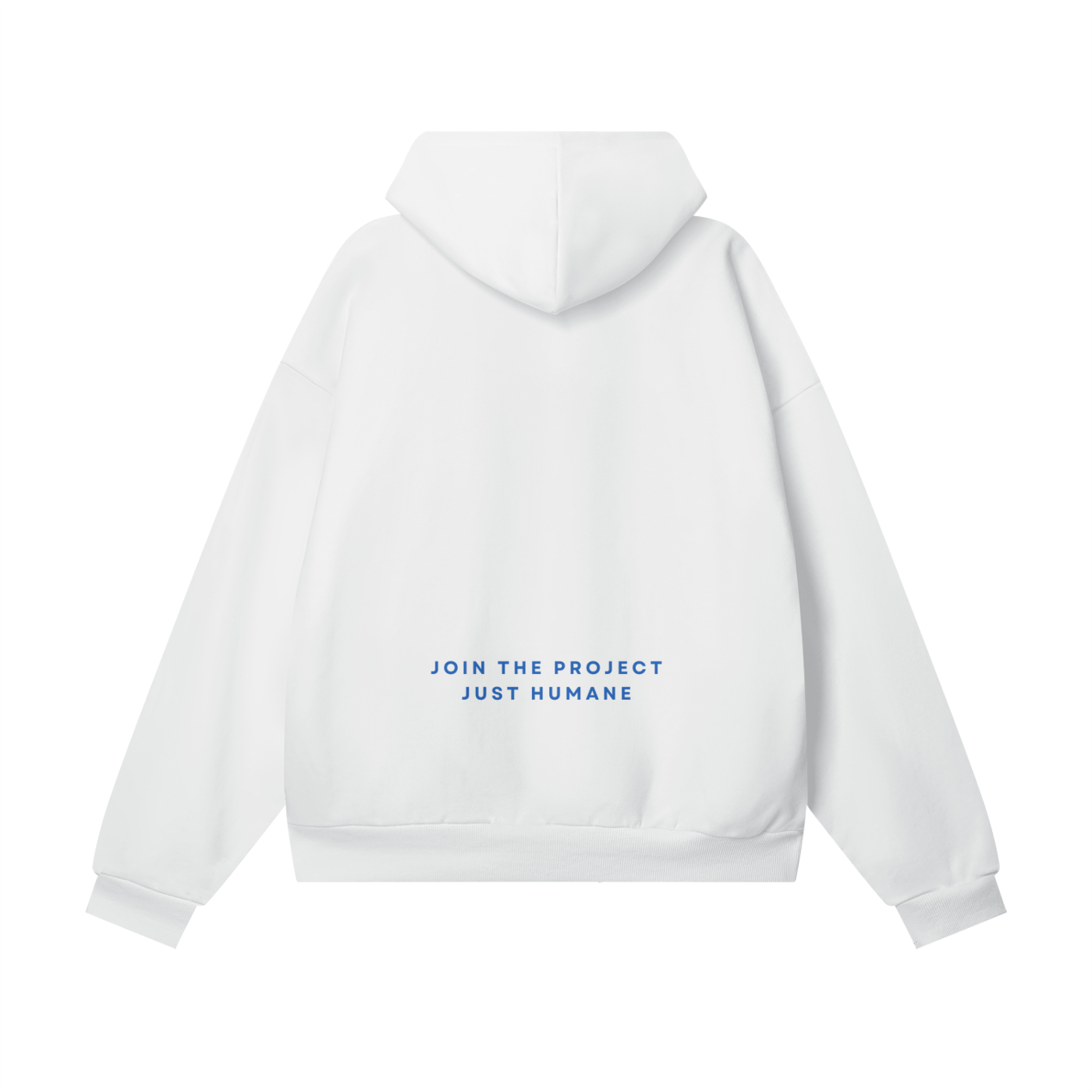 A white oversized heavyweight hoodie designed in premium fleece, featuring a hidden pocket for function and edge. Embroidered with the statement “Empathy Meets Action”, this piece represents the mission of the Just Humane Project where comfort and conscience come together. Built with a durable cotton-blend and an easy oversized fit, it’s made to wear every day, everywhere. Designed to keep you warm while standing for something bigger, it’s where style meets solidarity. Proceeds support people.